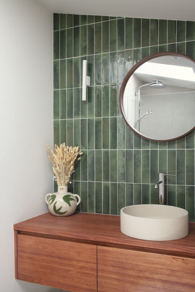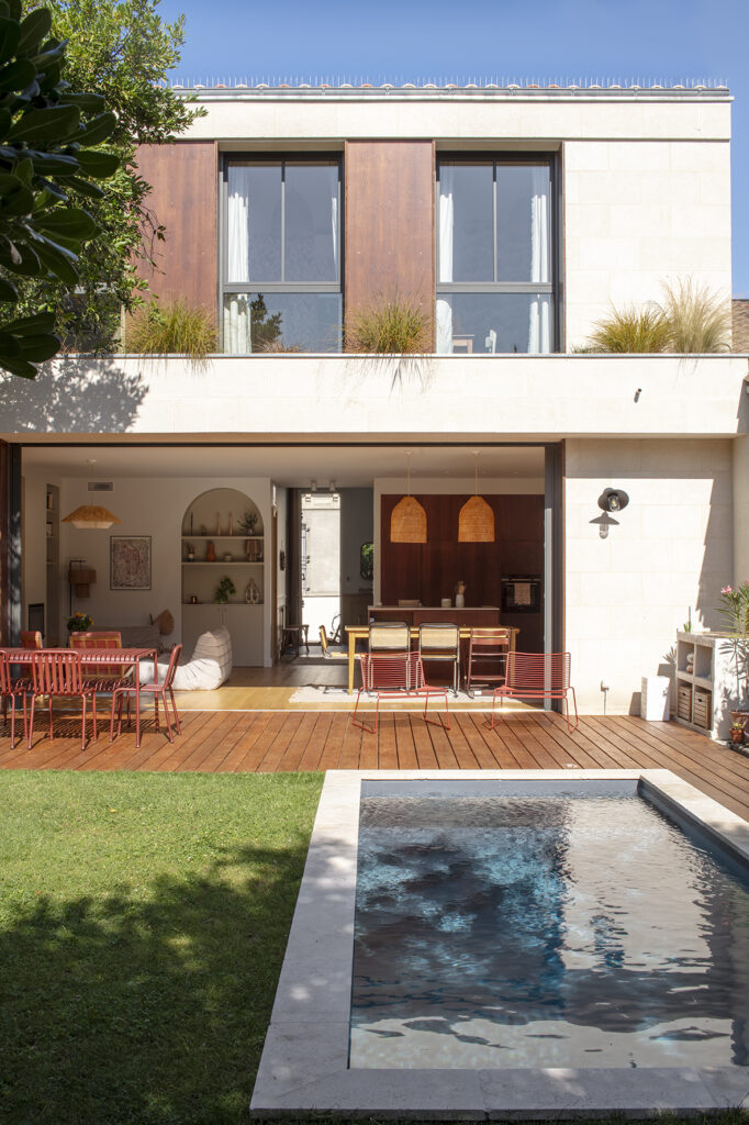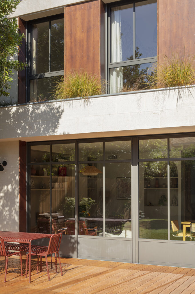 La façade sur jardin est en pierre, rythmé par l’alternance des panneaux de bois et des ouvertures des chambres. Une jardinière suspendue souligne l’horizontalité et intègre la nature à l’étage.