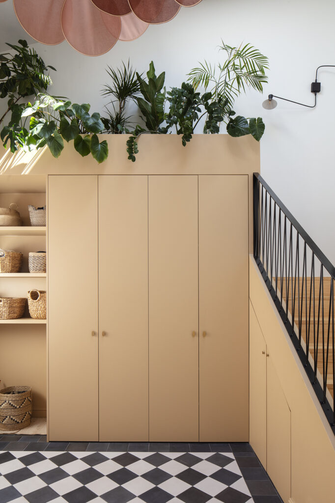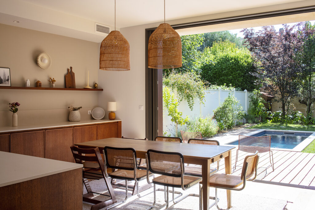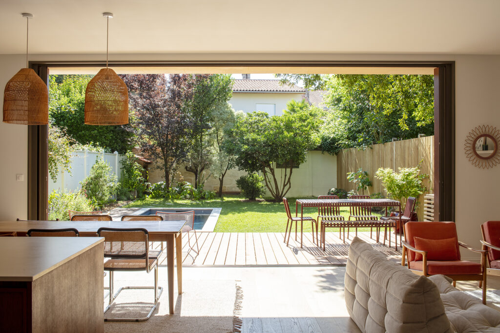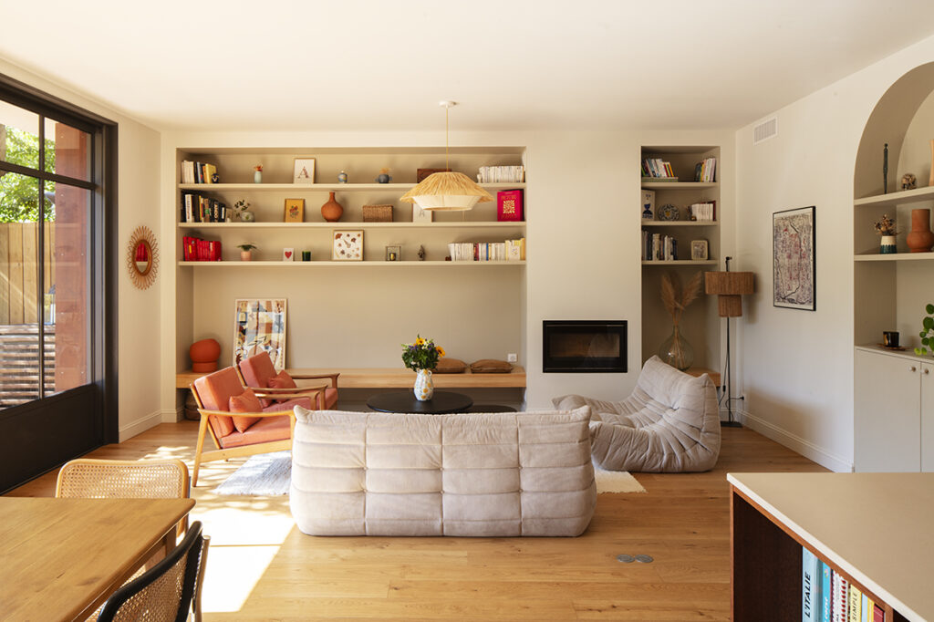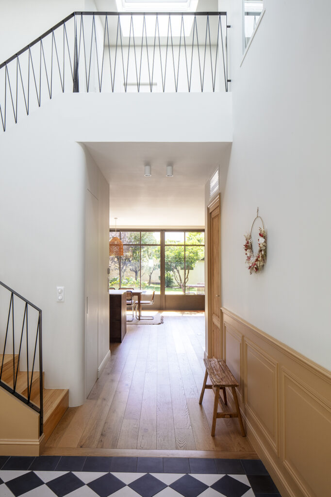 Le projet porte sur la surélévation d’une échoppe double. Dès l’entrée on est baigné dans un volume généreux avec une percée visuelle sur le jardin. Grâce à la baie à galandage dans la pièce de vie, la maison orchestre une forte relation entre intérieur et extérieur. Jeux de niveaux, lignes épurées, larges ouvertures structurent une expérience fluide ou la lumière naturelle, les matières sobres et les espaces en continuité composent une architecture moderne et agréable à vivre.